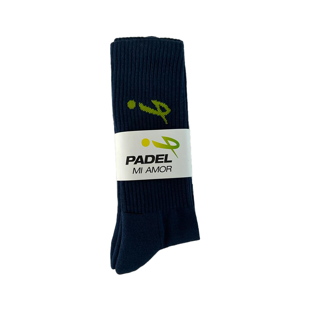 Paio di calze da padel in spugna di colore blu con logo Padel Mi Amor in evidenza, realizzate con cotone italiano al 100%. Le calze hanno punta e tallone rinforzati per garantire massimo comfort e stabilità durante le tue partite di padel.